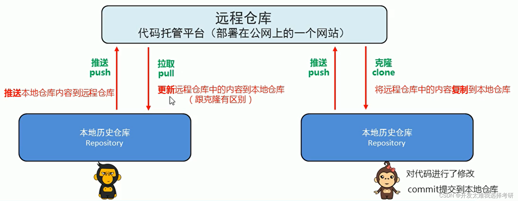 SVN时集中式的版本控制系统,版本库是集中在中央服务器的,而开发人员工作的时候用的都是自己的电脑,所以首先从中央服务器中下载最新的版本,然后再进行开发,开发后还要把自己的代码提交到中央服务器中。