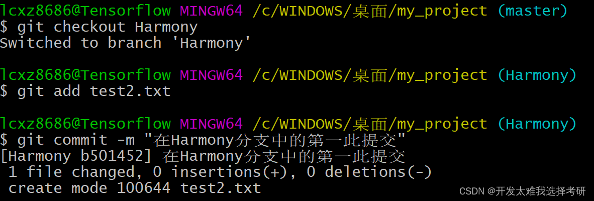 切换到Harmony分支,并且提交一次新的记录,test2.txt