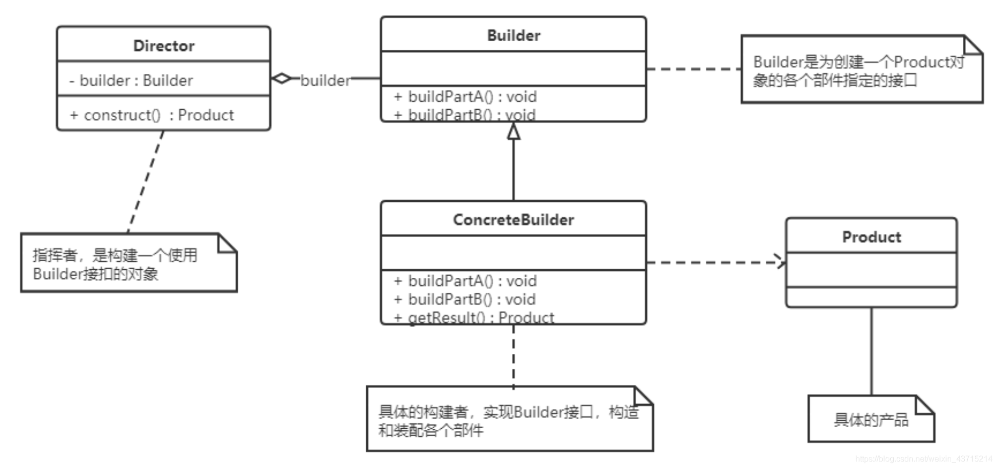 -  抽象建造者类(Builder):这个接口规定要实现复杂对象的那些部分的创建,并不涉及具体的部件对象的创建。