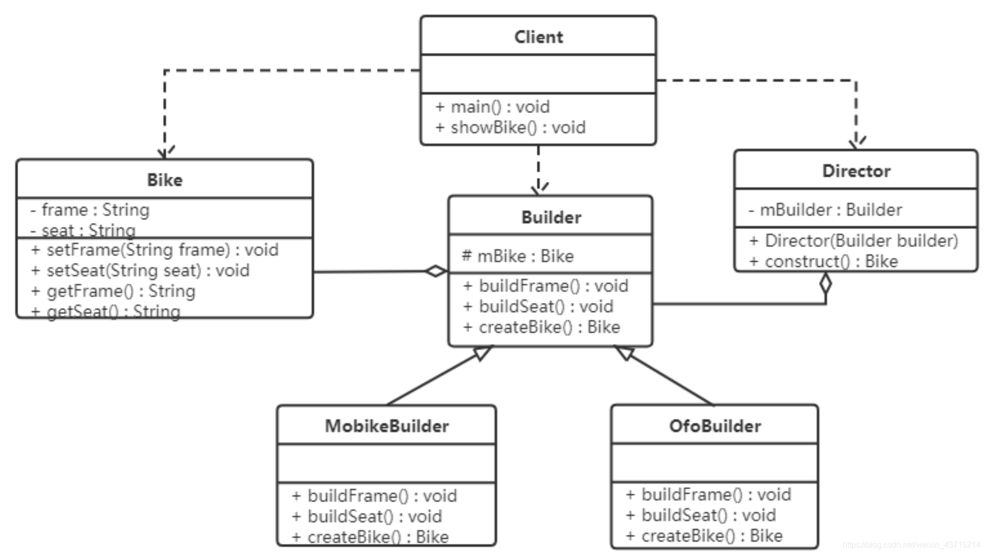 这里Bike是产品,包含车架,车座等组件;Builder是抽象建造者,MobikeBuilder和OfoBuilder是具体的建造者;Director是指挥者。