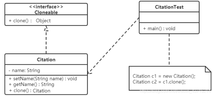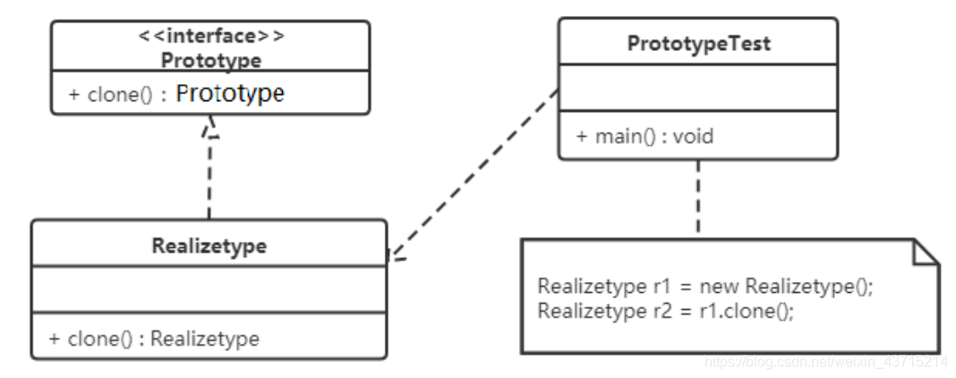访问类:使用具体原型类中的 clone() 方法来复制新的对象。