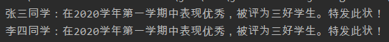 System.out.println(name + "同学:在2020学年第一学期中表现优秀,被评为三好学生。特发此状!");