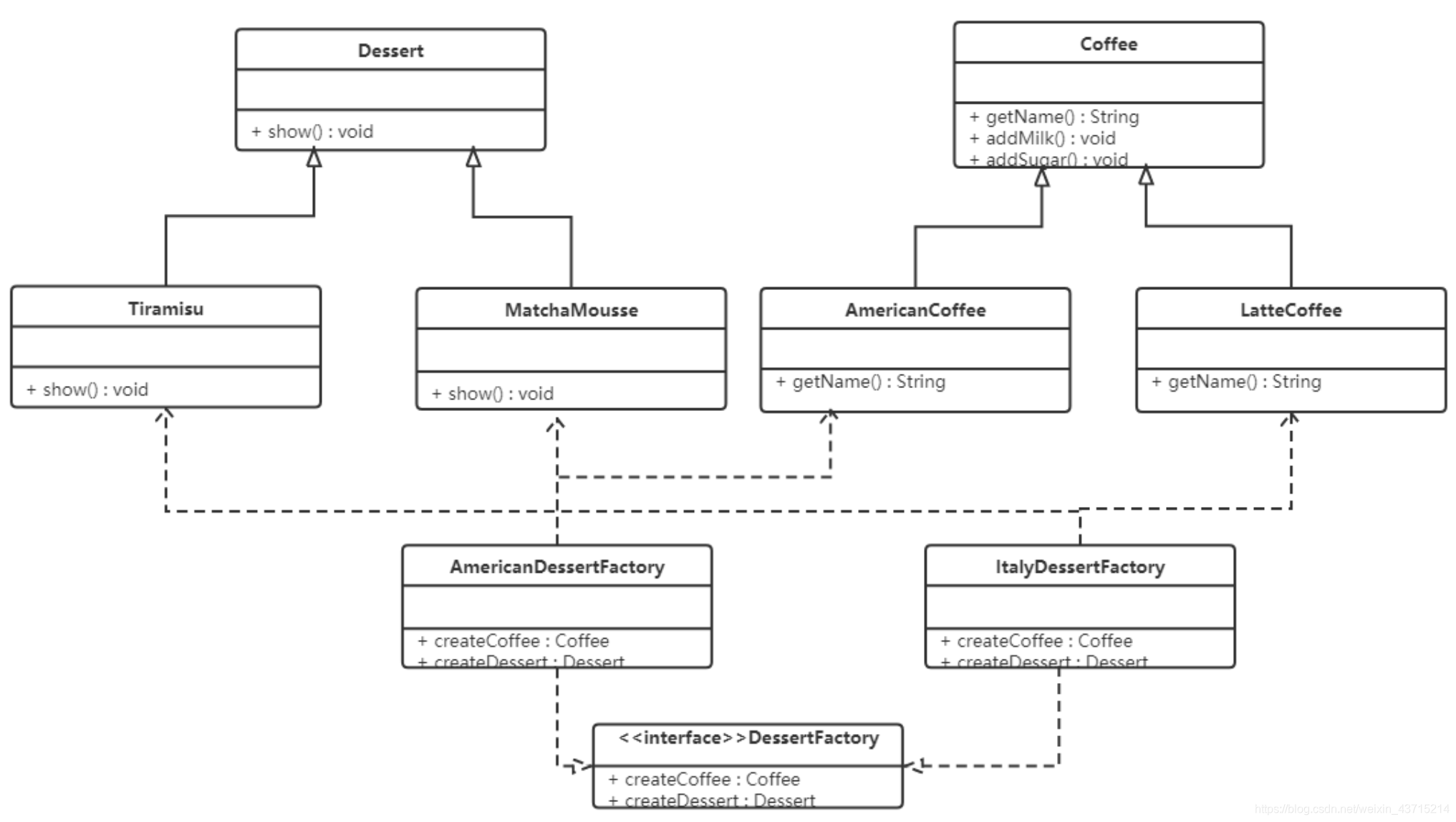 现咖啡店业务发生改变,不仅要生产咖啡还要生产甜点,如提拉米苏、抹茶慕斯等,要是按照工厂方法模式,需要定义提拉米苏类、抹茶慕斯类、提拉米苏工厂、抹茶慕斯工厂、甜点工厂类,很容易发生类爆炸情况。其中拿铁咖啡、美式咖啡是一个产品等级,都是咖啡;提拉米苏、抹茶慕斯也是一个产品等级;拿铁咖啡和提拉米苏是同一产品族(也就是都属于意大利风味),美式咖啡和抹茶慕斯是同一产品族(也就是都属于美式风味)。所以这个案例可以使用抽象工厂模式实现。