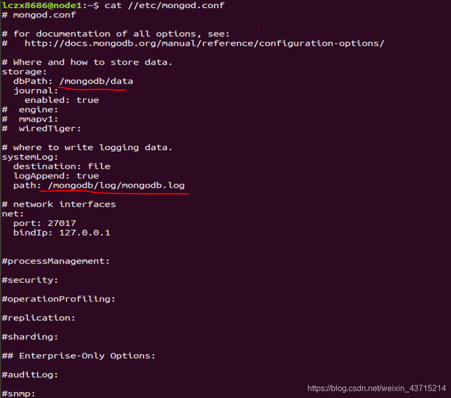 其中描述了mongodb的数据存储路径、日志存储路径、以及mongod服务的端口号
