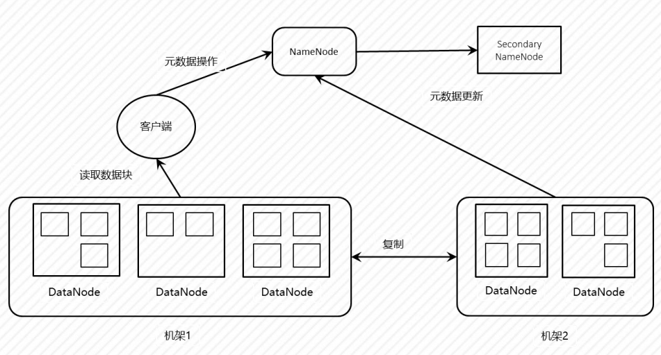 (1)负责存储文件的元数据,目录,文件,权限,文件分块,副本存储等信息