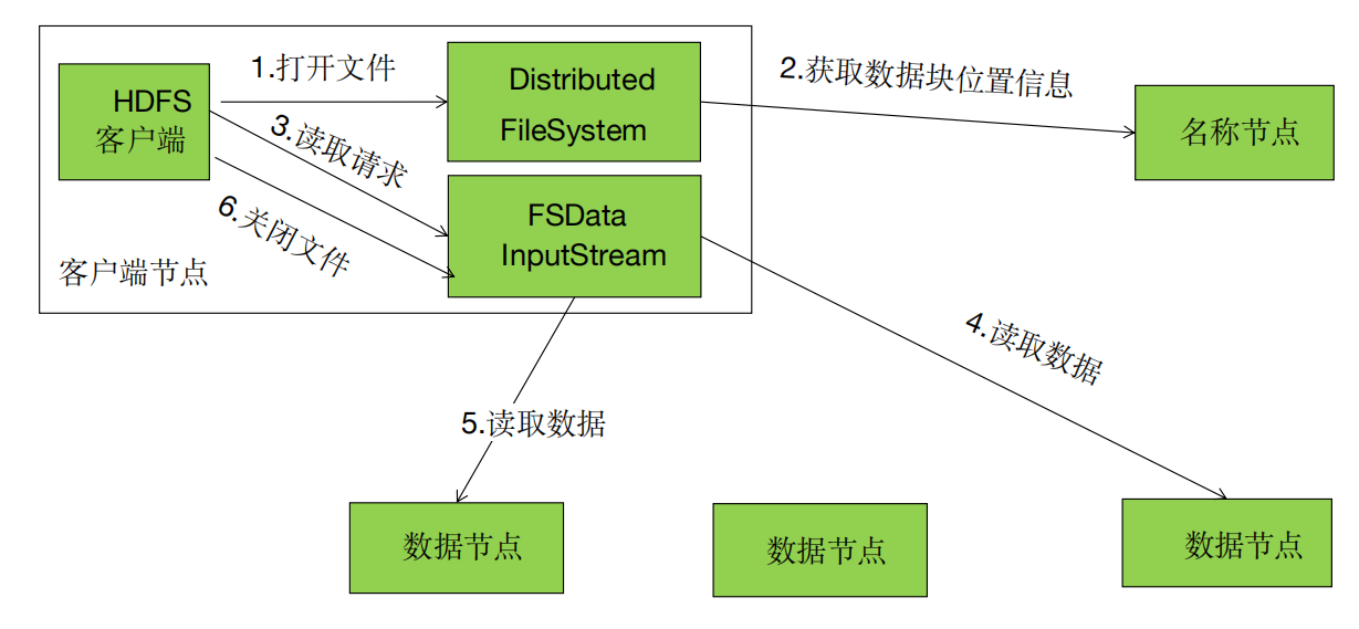 - 连接到DataNode:调用输入流 FSDataInputStream.read( ) 方法从而让DFSInputStream 连接到 DataNodes;
