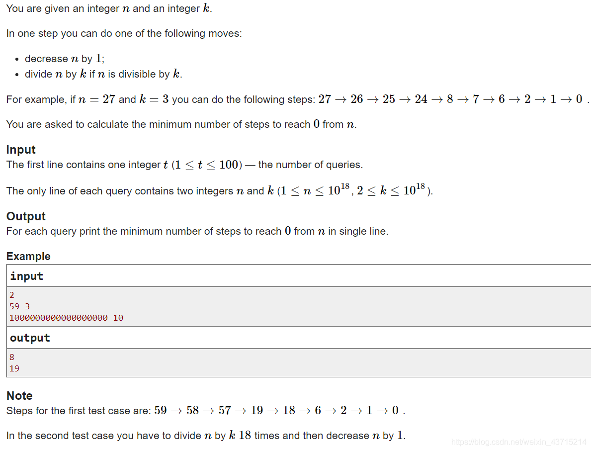一开始59 —> 19 进行第一个 if 操作, sum = sum+n%k , n =n - n%k 即(sum = 2,n = 57)等效替代了之前的两个 “ -1” 操作......