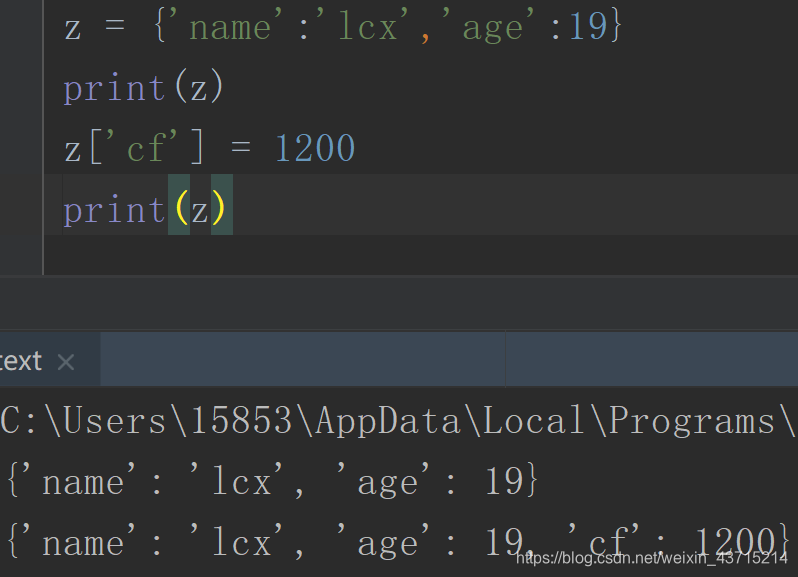 在z = {'name': 'lcx', 'age': 19, 'cf': 1200} 基础上进行操作。