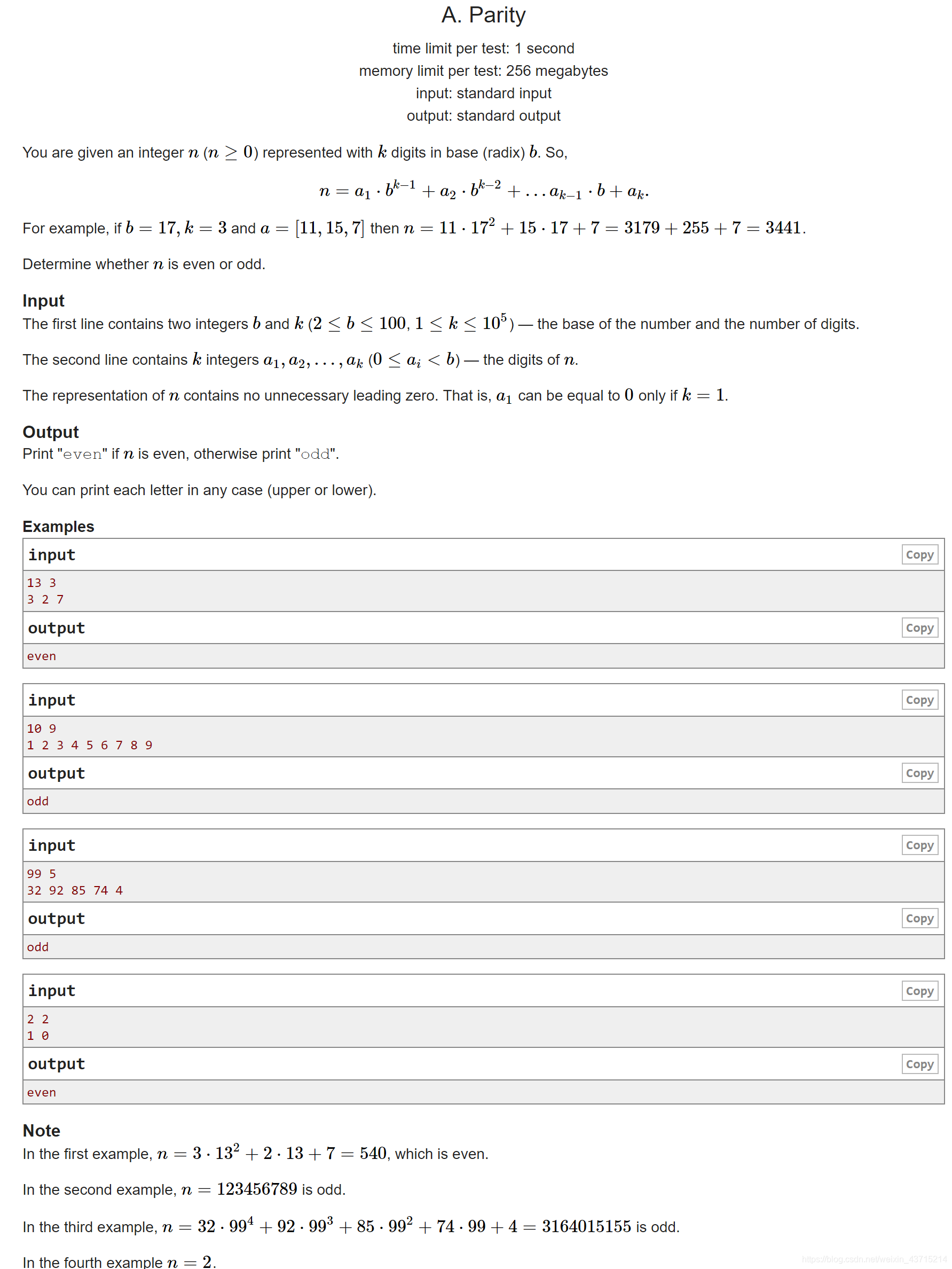本题要求b进制后的数字的奇偶性,如果是奇数输出odd,偶数输出even