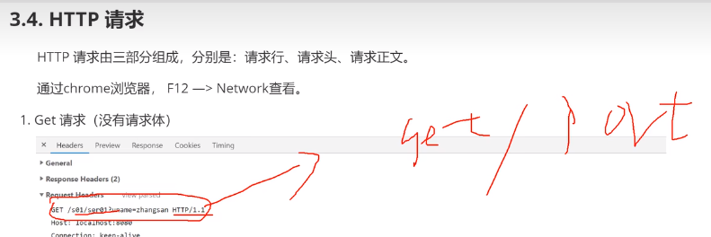 get请求没有请求正文,且请求行由请求方式(get/post)、请求地址(get地址后会跟参数)、请求协议版本
