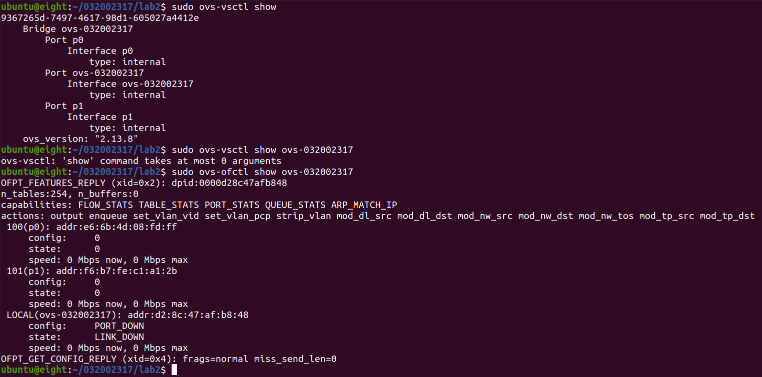 a) /home/用户名/学号/lab2/目录下执行ovs-vsctl show命令、以及p0和p1连通性测试的执行结果截图;