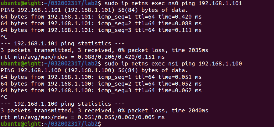 ovs-vsctl基础操作实践:创建OVS交换机,以ovs-xxxxxxxxx命名,其中xxxxxxxxx为本人学号。在创建的交换机上增加端口p0和p1,设置p0的端口号为100,p1的端口号为101,类型均为internal;为了避免网络接口上的地址和本机已有网络地址冲突,需要创建虚拟网络空间(参考命令netns)ns0和ns1,分别将p0和p1移入,并分别配置p0和p1端口的ip地址为190.168.1.100、192.168.1.101,子网掩码为255.255.255.0;最后测试p0和p1的连通性。