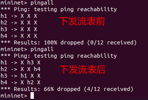 代码一次跑完,不能进入mininet界面继续操作;但所有的要求都可以在这里面直接实现
