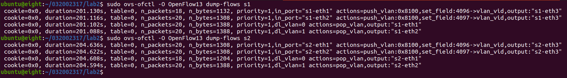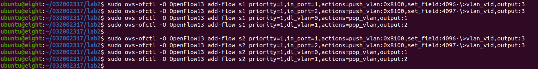 s2.cmd('sudo ovs-ofctl -O OpenFlow13 add-flow s2 priority=1,in_port=2,actions=push_vlan:0x8100,set_field:4097-\>vlan_vid,output:3')