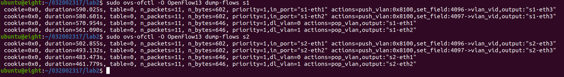 通过命令行终端输入“ovs-ofctl”命令,直接在s1和s2上添加流表,划分出所要求的VLAN。
