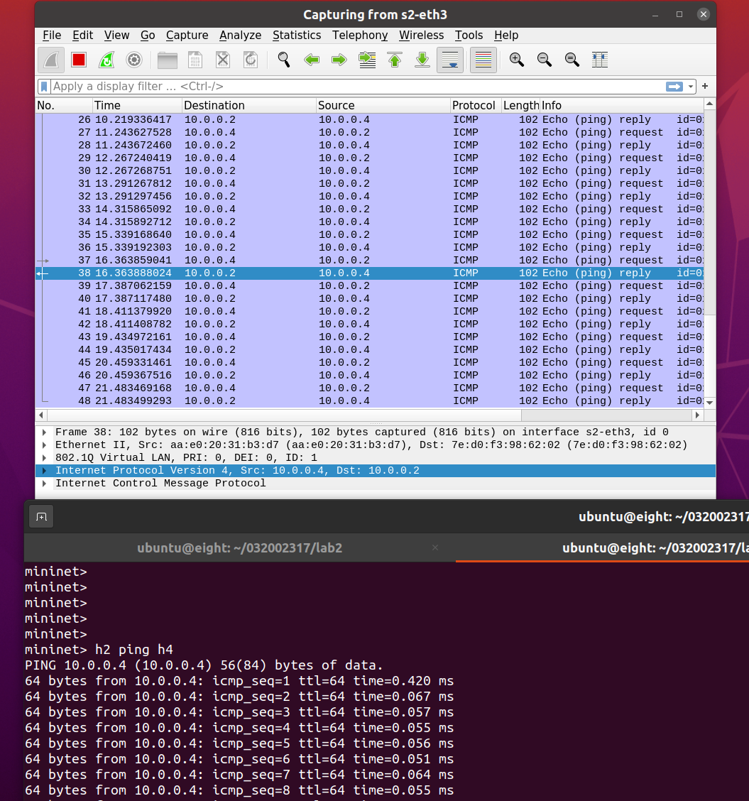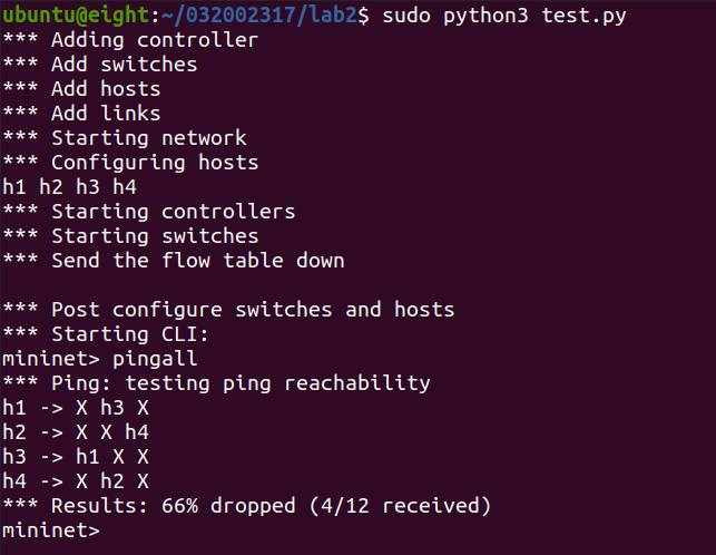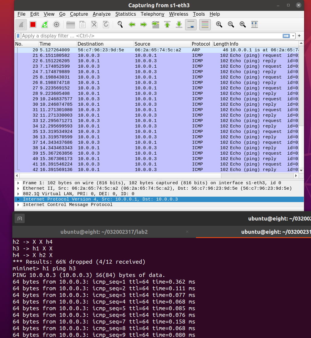 b) /home/用户名/学号/lab2/目录下开启Mininet CLI并执行pingall命令的截图、上述目录下查看OVS流表的命令结果截图,wireshark抓包截图,其余文字请勿赘述,否则扣分;