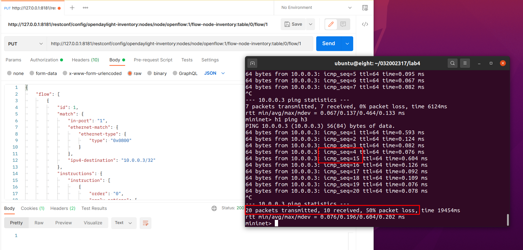 - 通过Postman工具调用OpenDaylight提供的API下发流表,实现拓扑内主机h1和h3网络中断10s。