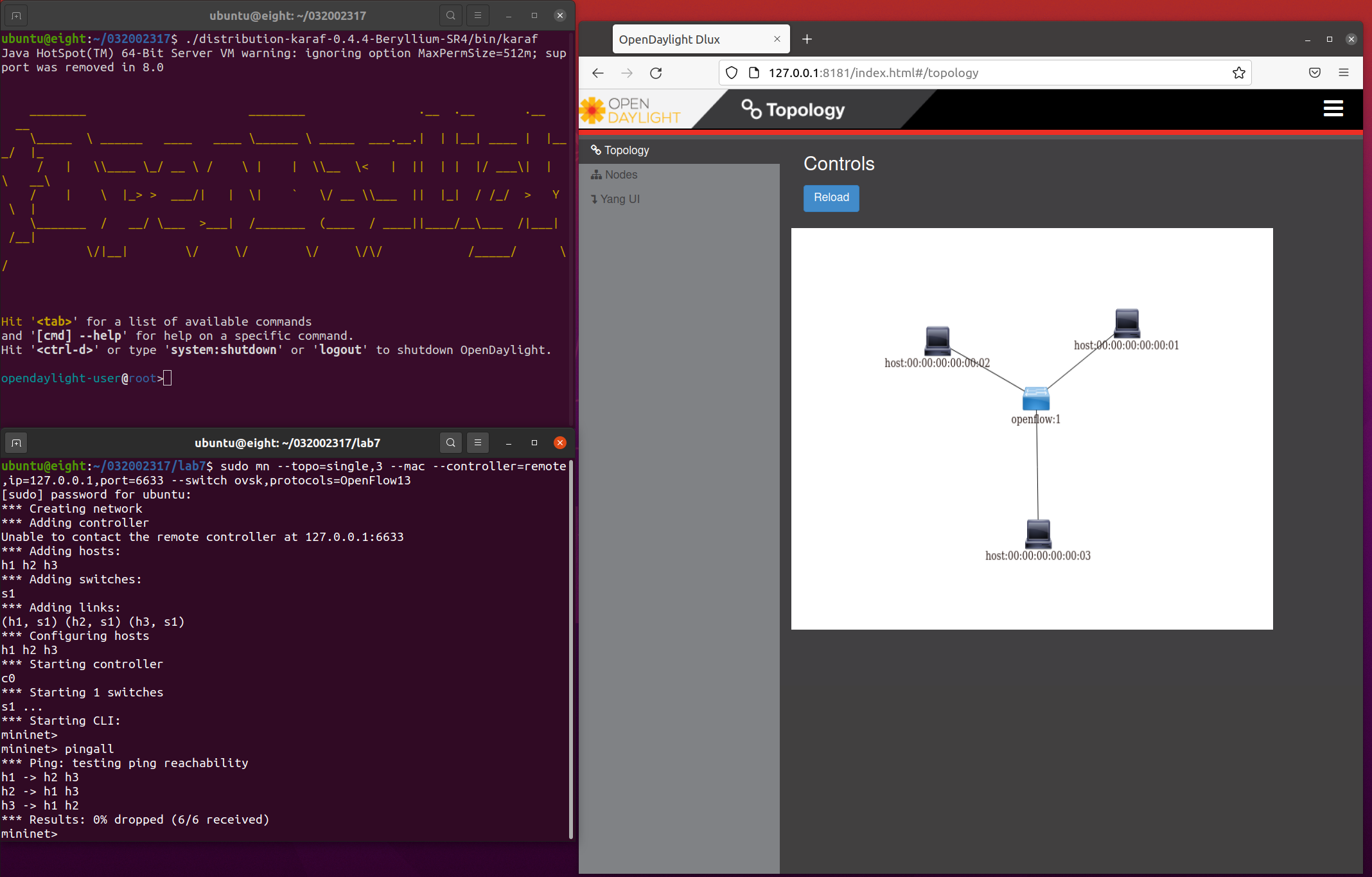 OpenDaylight或Ryu任选其一,编程实现查看前序VLAN实验拓扑中所有节点(含交换机、主机)的名称,以及显示每台交换机的所有流表项。