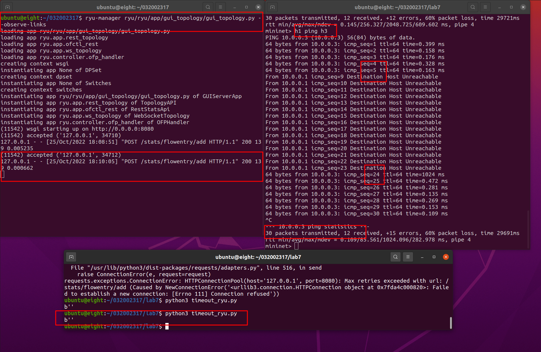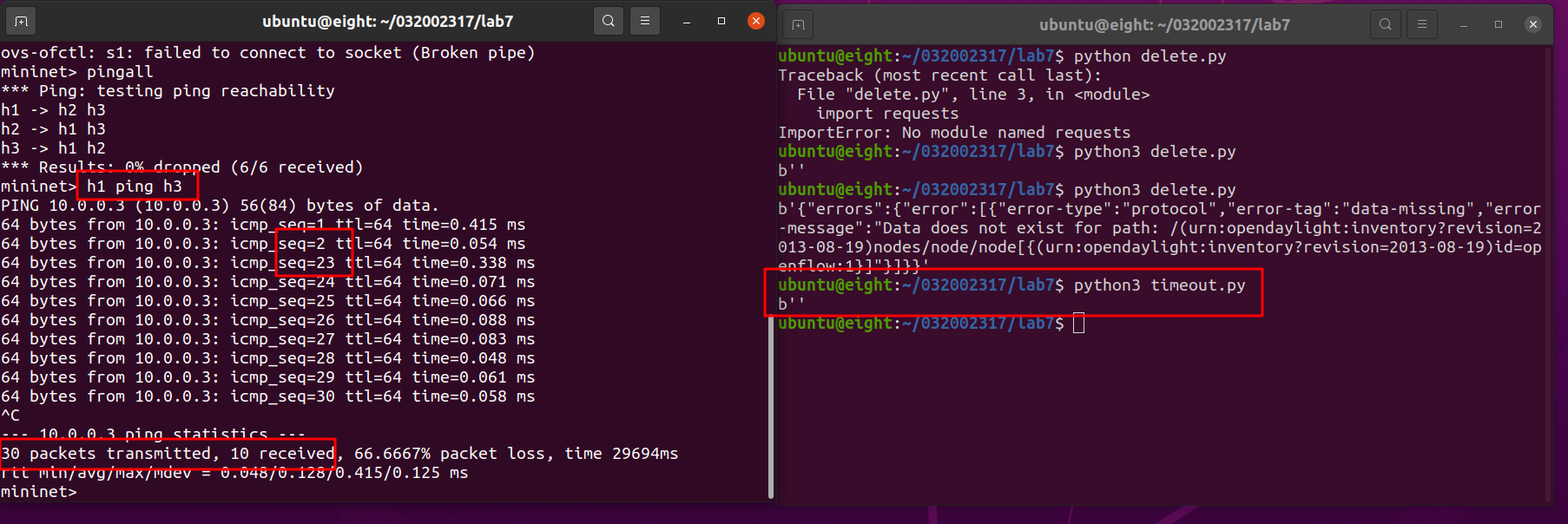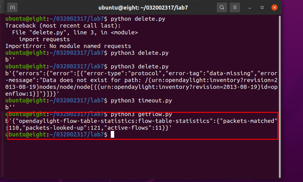 timeout_ryu.py执行时,一直无法正常工作。后来发现是一直在用之前的ODL的控制器;改成ryu的控制器,再执行python3 timeout_ryu.py即可。 -
