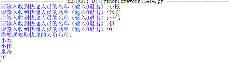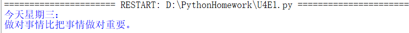 1 import datetime 2 mot = ["今天星期一:\n坚持下去不是因为我很坚强,而是因为我别无选择。", 3 "今天星期二:\n含泪播种的人一定能笑着收获。", 4 "今天星期三:\n做对的事情比把事情做对重要。", 5 "今天星期四:\n命运给予我们的不是失望之酒,而是机会之杯。", 6 "今天星期五:\n不要等到明天,明天太遥远,今天就行动。", 7 "今天星期六:\n求知若饥,虚心若愚。", 8 "今天星期日:\n成功将属于那些从不说”不可能“的人。"] 9 day = datetime.datetime.now().weekday() 10 print(mot[day])