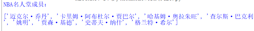 1 #原有球员 2 oldlist = ["迈克尔·乔丹","卡里姆·阿布杜尔·贾巴尔","哈基姆·奥拉朱旺","查尔斯·巴克利","姚明"] 3 #新增球员 4 newlist =["贾森·基德" ,"史蒂夫·纳什", "格兰特·希尔"] 5 oldlist.extend(newlist) 6 print(oldlist)