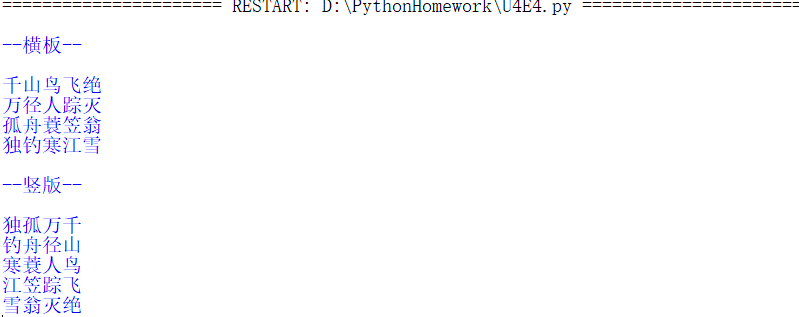 1 str1 = "千山鸟飞绝" 2 str2 = "万径人踪灭" 3 str3 = "孤舟蓑笠翁" 4 str4 = "独钓寒江雪" 5 #定义一个二维列表 6 verse = [list(str1), list(str2), list(str3), list(str4)] 7 print("\n-------横板-------\n") 8 for i in range(4): 9 for j in range(5): 10 if j == 4: 11 print(verse[i][j]) #换行 12 else: 13 print(verse[i][j],end = '') #不换行 14 verse.reverse() 15 print("\n-------竖板-------\n") 16 for i in range(5): 17 for j in range(4): 18 if j == 3: 19 print(verse[j][i]) #换行 20 else: 21 print(verse[j][i], end = '') #不换行