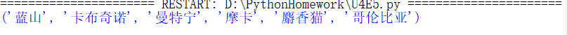 1 coffeename = ('蓝山','卡布奇诺','曼特宁','摩卡','麝香猫','哥伦比亚') 2 print(coffeename)