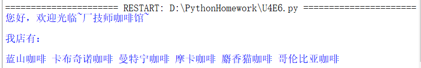1 coffeename = ('蓝山','卡布奇诺','曼特宁','摩卡','麝香猫','哥伦比亚') #定义元组 2 print("您好,欢迎光临~伊米咖啡馆~\n我店有:") 3 for name in coffeename: 4 print(name + "咖啡", end=' ')