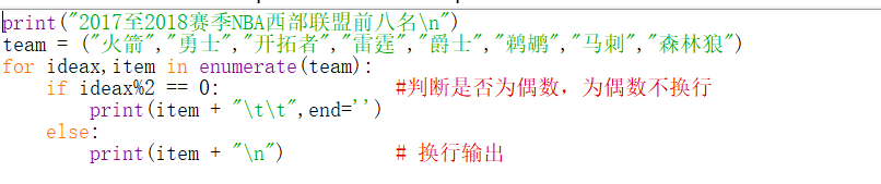 1 print("2017~2018赛季NBA西部联盟前八名\n") 2 team = ["火箭", "勇士", "开拓者", "雷霆", "爵士", "鹈鹕", "马刺", "森林狼"] 3 for index,item in enumerate(team): 4 if index % 2 == 0: #索引为偶数则不换行输出 5 print(item + "\t\t", end='') 6 else: 7 print(item + "\n")