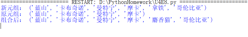 1 coffeename = ('蓝山','卡布奇诺','曼特宁','摩卡','麝香猫','哥伦比亚') #定义元组 2 coffeename = ('蓝山','卡布奇诺','曼特宁','摩卡','拿铁','哥伦比亚') 3 print(coffeename)