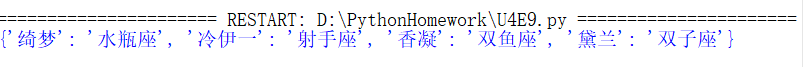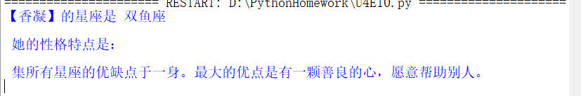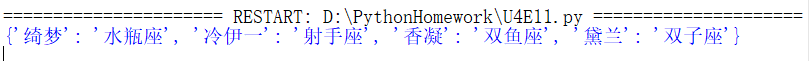 1 name =['绮梦','冷伊一','香凝','黛兰'] #作为键的列表 2 sign_person =['水瓶座','射手座','双鱼座','双子座'] #作为值的列表 3 person_dict = dict(zip(name, sign_person)) #转换位个人字典 4 sign_all =['白羊座','金牛座','双子座','巨蟹座','狮子座', 5 '处女座','天秤座','天蝎座','射手座','摩羯座','水瓶座','双鱼座'] 6 nature = ['有一种让人看见就觉得开心的感觉,阳光、乐观、坚强,性格直来直去,就是有点小脾气。', 7 '很保守,喜欢稳定,一旦有什么变动就会觉得心里不踏实,性格比较慢热,是个理财高手。', 8 '喜欢追求新鲜感,有点小聪明,耐心不够,因你的可爱性格会让很多人喜欢和你做朋友。', 9 '情绪容易敏感,缺乏安全感,做事情有坚持到底的毅力,为人重情重义,对朋友和家人特别忠实。', 10 '有着远大的理想,总想靠自己的努力成为人上人,总是期待被仰慕被崇拜的感觉。', 11 '坚持追求自己的完美主义者。', 12 '追求平等、和谐,交际能力强,因此朋友较多。最大的缺点就是面对选择总是犹豫不决。', 13 '精力旺盛,占有欲强,对于生活很有目标,不达目的誓不罢休,复仇心重。', 14 '崇尚自由,勇敢、果断、独立,身上有一股勇往直前的劲儿,只要想做,就能做。', 15 '是最有耐心的,做事最小心。做事脚踏实地,比较固执,不达目的不罢休,而且非常勤奋。', 16 '人很聪明,最大的特点是创新,追求独一无二的生活,个人主义色彩很浓重的星座。', 17 '集所有星座的优缺点于一身。最大的优点是有一颗善良的心,愿意帮助别人。'] 18 sign_dict = dict(zip(sign_all, nature)) #转换为星座字典 19 print("【香凝】的星座是" ,person_dict.get("香凝")) #get获取"香凝"的健值 20 print("\n她的性格特点是:\n",sign_dict.get(person_dict.get("香凝")))