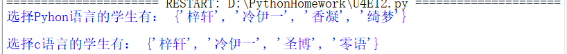 1 python = set(['绮梦', '冷伊一', '香凝', '梓轩']) 2 python. add('零语') #添加一个元素进集合 3 c = set(['冷伊一', '零语', '梓轩', '圣博']) 4 c.remove('零语') #删除一个元素 5 print("选择Python语言的学生有:", python) 6 print("选择C语言的学生有:", c)