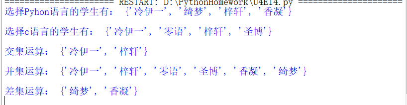 1 python = set(['绮梦', '冷伊一', '香凝', '梓轩']) 2 c = set(['冷伊一', '零语', '梓轩', '圣博']) 3 print("选择Python语言的学生有:", python) 4 print("选择C语言的学生有:", c) 5 #输出既选择了Python语言又选择了C语言的学生姓名 6 print("交集运算:", python & c) 7 #输出参与选择的全部学生姓名 8 print("并集运算:", python | c) 9 #输出只选择Python没有选择C的学生姓名 10 print("差集运算:", python - c)
