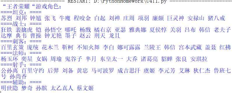 1 print("“王者荣耀“游戏角色:") 2 print("====坦克:====") 3 tank = ["苏烈","刘邦","钟馗","张飞","牛魔","程咬金","白起","刘禅","庄周","项羽","廉颇","巨灵神","安禄山","猪八戒"] 4 for i in tank: 5 print(i,end=" ") 6 print("\n"+"====战士:====") 7 warrior = ["狂铁","裴擒虎","铠","孙悟空","哪吒","杨戬","橘右京","亚瑟","雅典娜","夏侯惇","关羽","吕布","韩信","老夫子","达摩", 8 "典韦","曹操","钟无艳","墨子","赵云","刑天","龙且"] 9 for i in warrior: 10 print(i,end=" ") 11 print("\n"+"====刺客:====") 12 assassin = ["百里玄策","庞统","花木兰","靳柯","不知火舞","李白","娜可露露","兰陵王","韩信","宫本武藏","盖聂","红拂"] 13 for i in assassin: 14 print(i,end=" ") 15 print("\n"+"====法师:====") 16 master = ["杨玉环","奕星","女娲","周瑜","鬼谷子","芈月","东皇太一","大乔","诸葛亮","貂蝉","张良","安琪拉"] 17 for i in master: 18 print(i,end=" ") 19 print("\n"+"====射手:====") 20 shooter = ["公孙离","百里守约","后羿","刘备","黄忠","马可波罗","成吉思汗","虞姬","李元芳","艾琳","狄仁杰","鲁班七号","孙尚香"] 21 for i in shooter: 22 print(i,end=" ") 23 print("\n"+"====辅助:====") 24 auxiliary = ["明世隐","梦奇","孙膑","太乙真人","蔡文姬"] 25 for i in auxiliary: 26 print(i,end=" ")