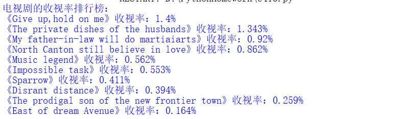 1 #电视剧列表 2 TV = [("《Give up, hold on to me》收视率:","1.4%"), 3 ("《The private dishes of the husbands》收视率:","1.343%"), 4 ("《My father-in-law will do martiaiarts》收视率:","0.92%"), 5 ("《North Canton still believe in love》收视率:","0.862%"), 6 ("《Impossible task》收视率:","0.553%"), 7 ("《Sparrow》收视率:","0.411%"), 8 ("《East of dream Avenue》收视率:","0.164%"), 9 ("《The prodigal son of the new frontier town》收视率:","0.259%"), 10 ("《Distant distance》收视率:","0.394%"), 11 ("《Music legend》收视率:","0.562%")] 12 #对元素的第二个字段进行排序 13 TV.sort(key=lambda x:x[1], reverse=True) 14 for item in TV: 15 print(item[0] + str(item[1])) 16 # for i in TV: 17 # for j in range(0, 2): 18 # if j == 1: 19 # print(i[j]) 20 # else: 21 # print(i[j], end="")
