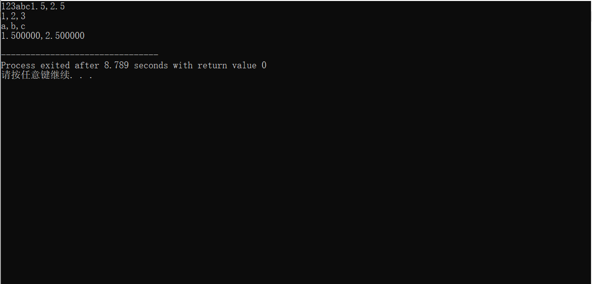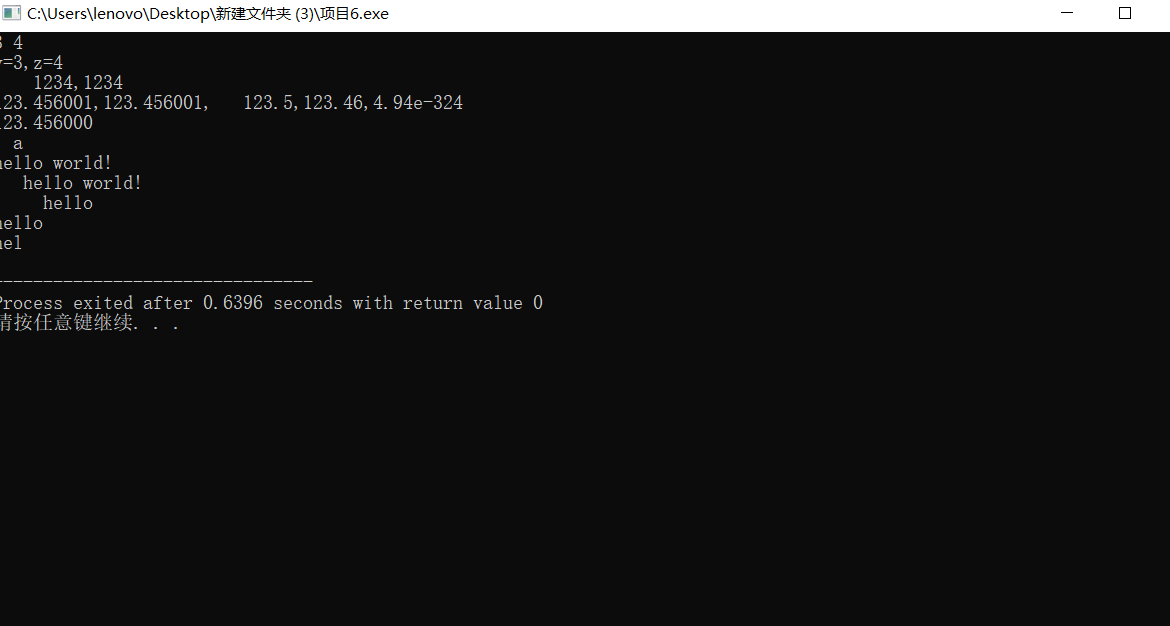 int main(int argc, char** argv) { int x=1234; float f=123.456; double m=123.456; char ch='a'; char a[]="hello world!"; int y=3,z=4; printf("%d %d\n",y,z); printf("y=%d,z=%d\n",y,z); printf("%8d,%2d\n",x,x); printf("%f,%8f,%8.1f,%0.2f,%.2e\n",f,f,f,f); printf("%1f\n",m); printf("%3c\n",ch); printf("%s\n%15s\n%10.5s\n%2.5s\n%.3s\n",a,a,a,a,a); return 0; }