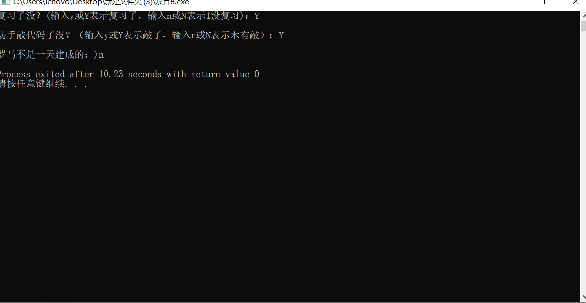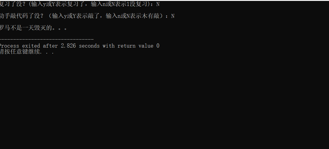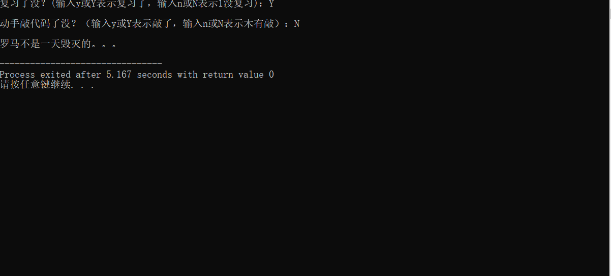 int main(int argc, char** argv) { char ans1,ans2; printf("复习了没?(输入y或Y表示复习了,输入n或N表示1没复习):"); ans1=getchar(); getchar(); printf("\n动手敲代码了没?(输入y或Y表示敲了,输入n或N表示木有敲):"); ans2 = getchar(); if(ans1=='y'||ans1=='Y'&&ans2=='y'||ans2=='Y') printf("\n罗马不是一天建成的:)n"); else printf("\n罗马不是一天毁灭的。。。\n"); return 0; }