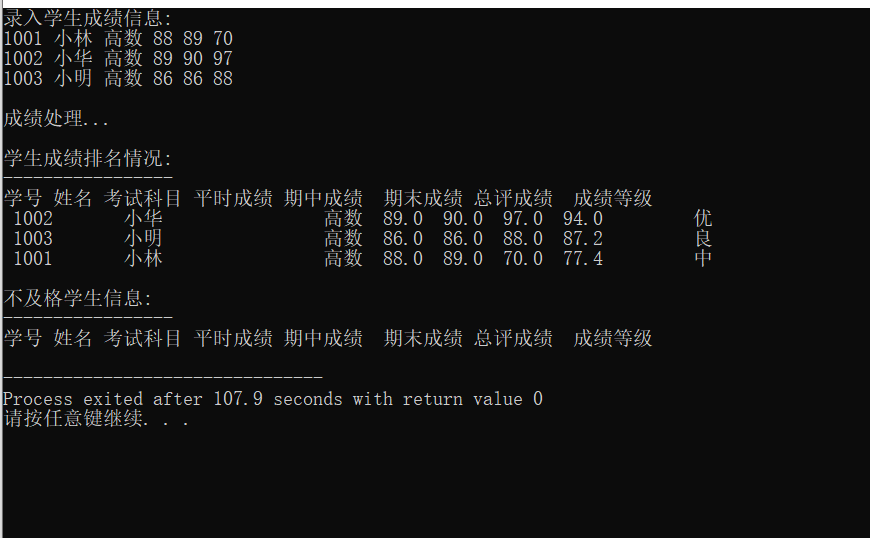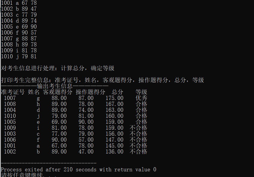 printf("\n对考生信息进行处理:计算总分,确定等级\n");