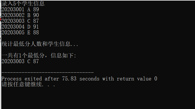 printf("\n一共有%d个最低分,信息如下:\n", count);