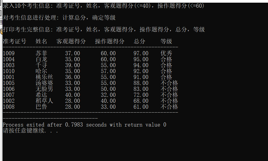 printf("\n打印考生完整信息: 准考证号,姓名,客观题得分,操作题得分,总分,等级\n");