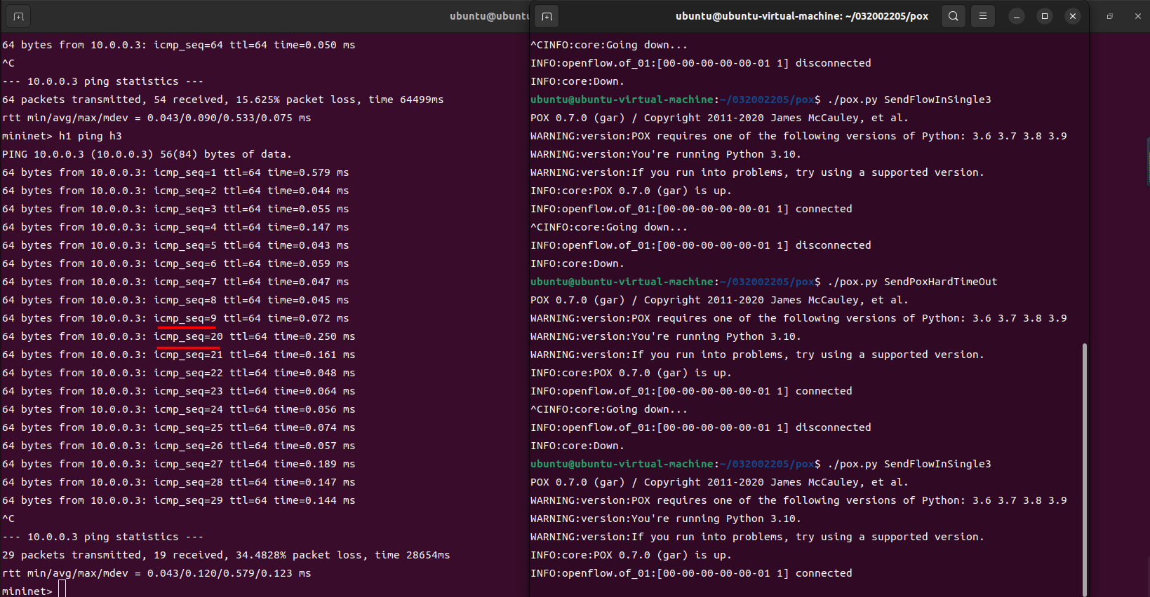 本次实验难度适中,主要学习POX控制器。通过验证POX的forwarding.hub和forwarding.l2_learning模块,我初步掌握POX 控制器的使用方法,除此之外,我了解了如何通过编写代码实现硬实时功能,进一步熟悉POX控制器流表下发的方法。本次实验中,我遇到了一个问题,当我关闭hub模块开启L2_Learning模块时出现了错误。通过搜索资料后,我发现是因为使用6633这个端口号的进程还在进行,导致冲突,引起报错。同时,本实验需注意,生成拓扑后,再开启POX。我认为自己还需要进一步学习一些相关知识。
