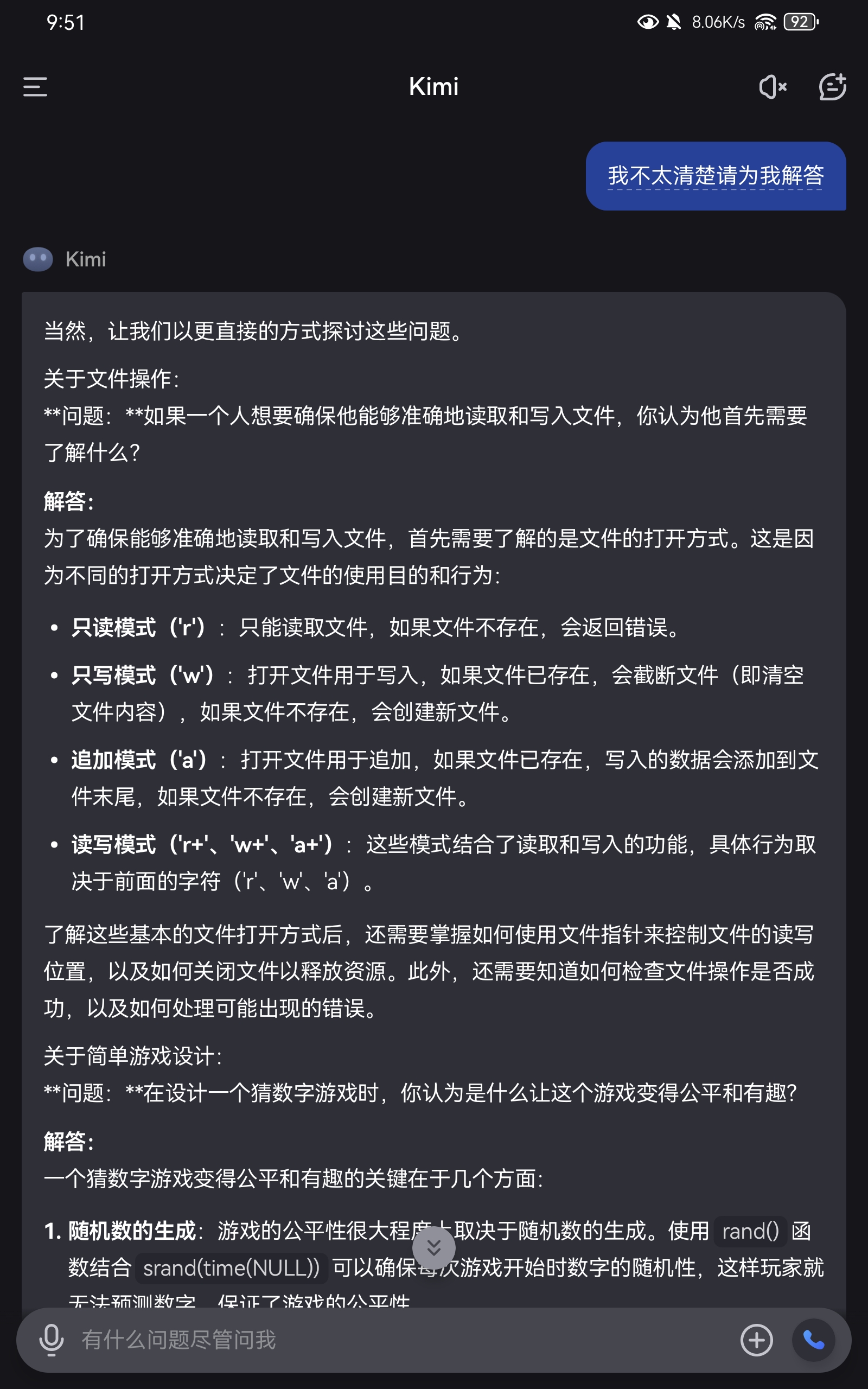 • 文件打开方式包括只读(r)、只写(w)、追加(a)、读写(+)、二进制(b)等。