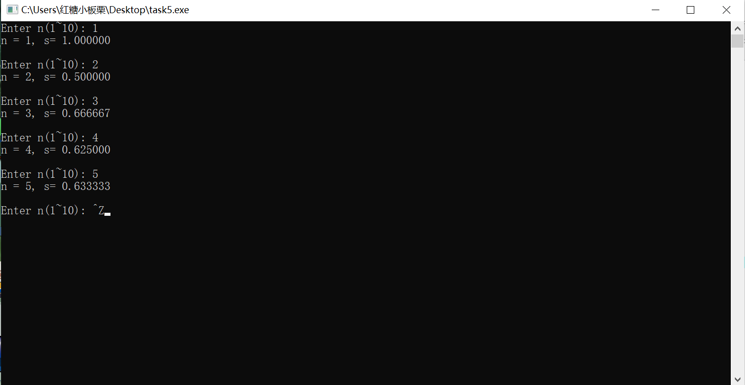 printf("n = %d, s= %f\n\n", n, s);