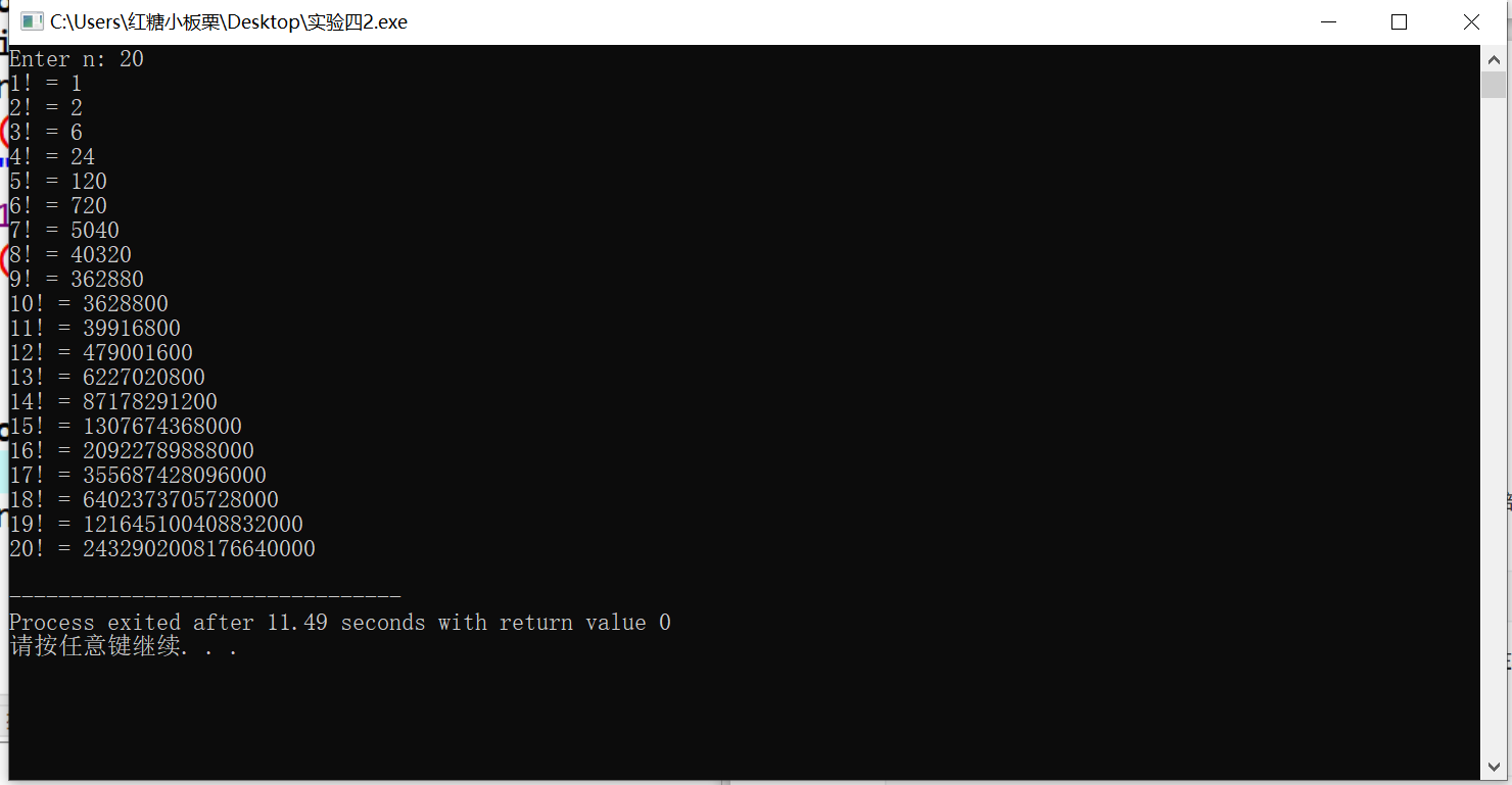 printf("%d! = %lld\n", i, fac(i));