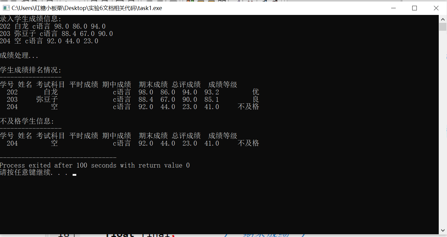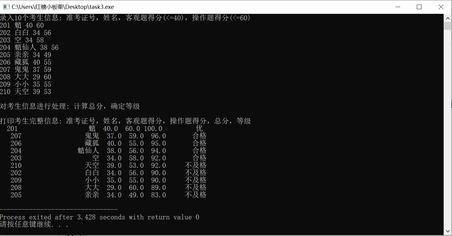 printf("\n打印考生完整信息: 准考证号,姓名,客观题得分,操作题得分,总分,等级\n");