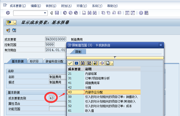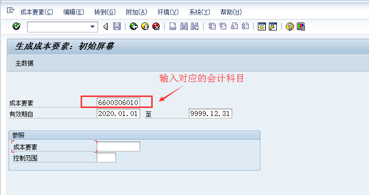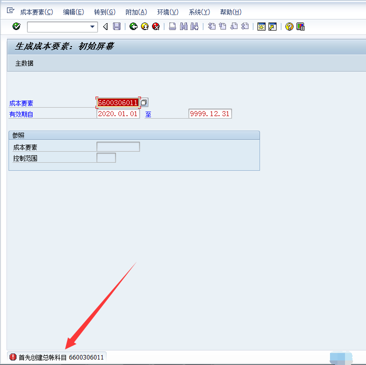 在成本要素框中输入会计科目号,如果会计科目不存在,系统会提示错误(下图)。