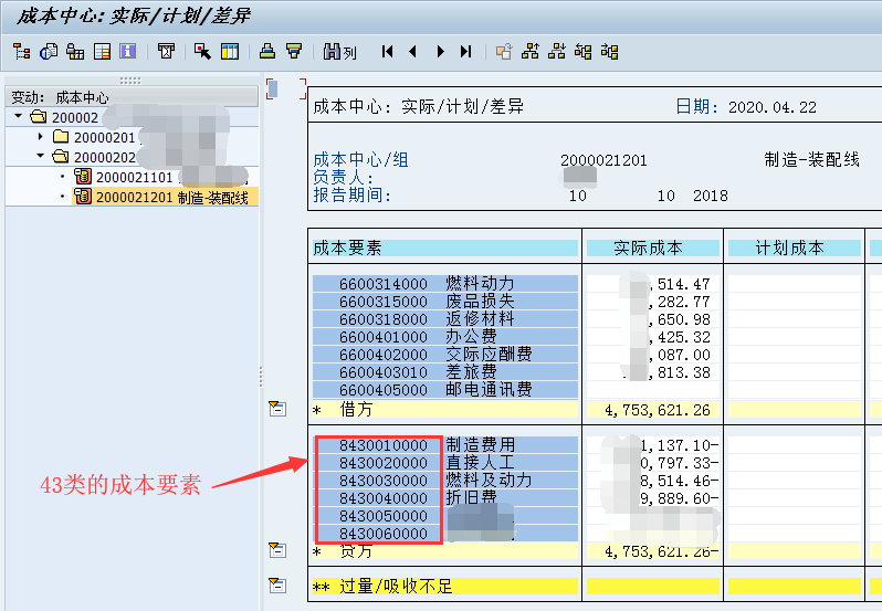 大家通过事务码S_ALR_87013611在生产类成本中心看到的次级成本要素就是此类成本要素。通过43类的次级成本要素,实现成本中心到订单的成本流转。下图中“过量/吸收不足”余额为0,说明成本中心费用全部结转到生产订单。