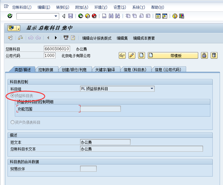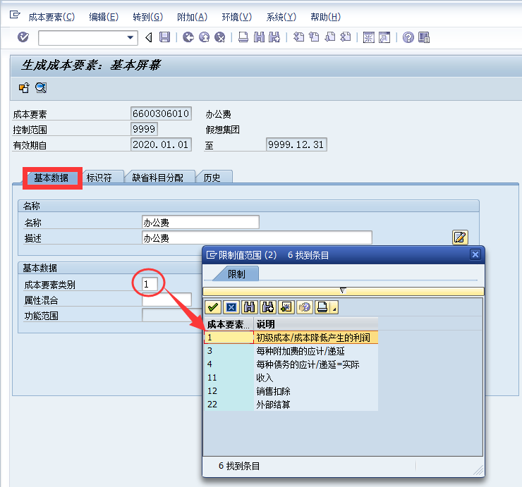 一般情况下,我们只对损益表科目创建初级成本要素,FS00查看办公费科目如下。