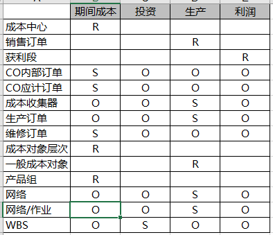 这些对象类别会默认被分配给不同的对象中(SAP也允许分配到不同的对象类别),如下图(R表示必须唯一且固定,S表示默认值,O表示可以变换的):