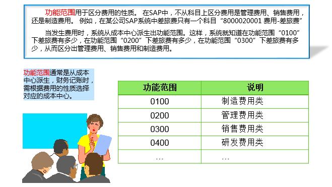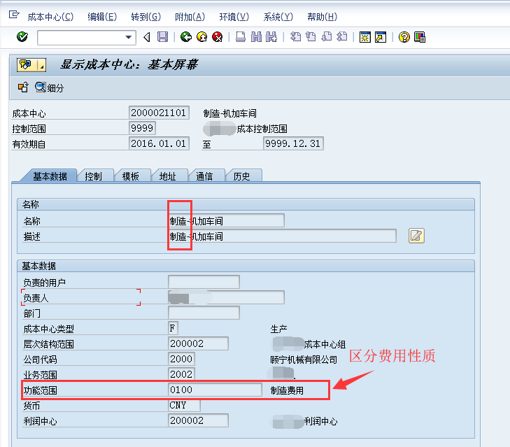 在SAP中一般不通过科目编号来区分管理费用、销售费用、制造费用,而是通过“功能范围”来区分费用性质。在成本中心里指定“功能范围”,录入费用凭证时通过成本中心就可以派生出功能范围。因此一个部门下既有管理费用,又有制造费用时,需要创建两个成本中心,一般在描述中加上“管理-”或“制造-”的前缀。